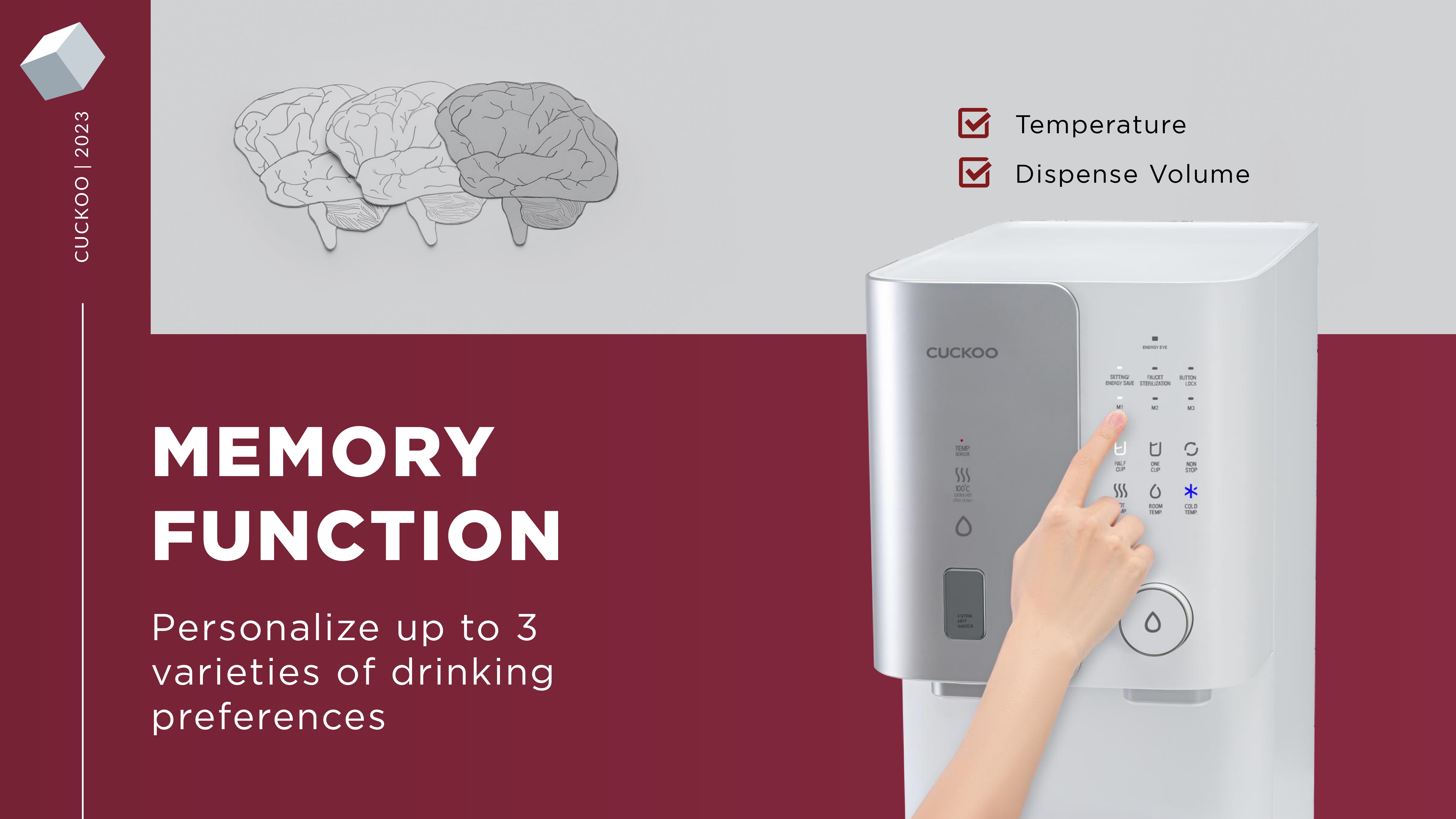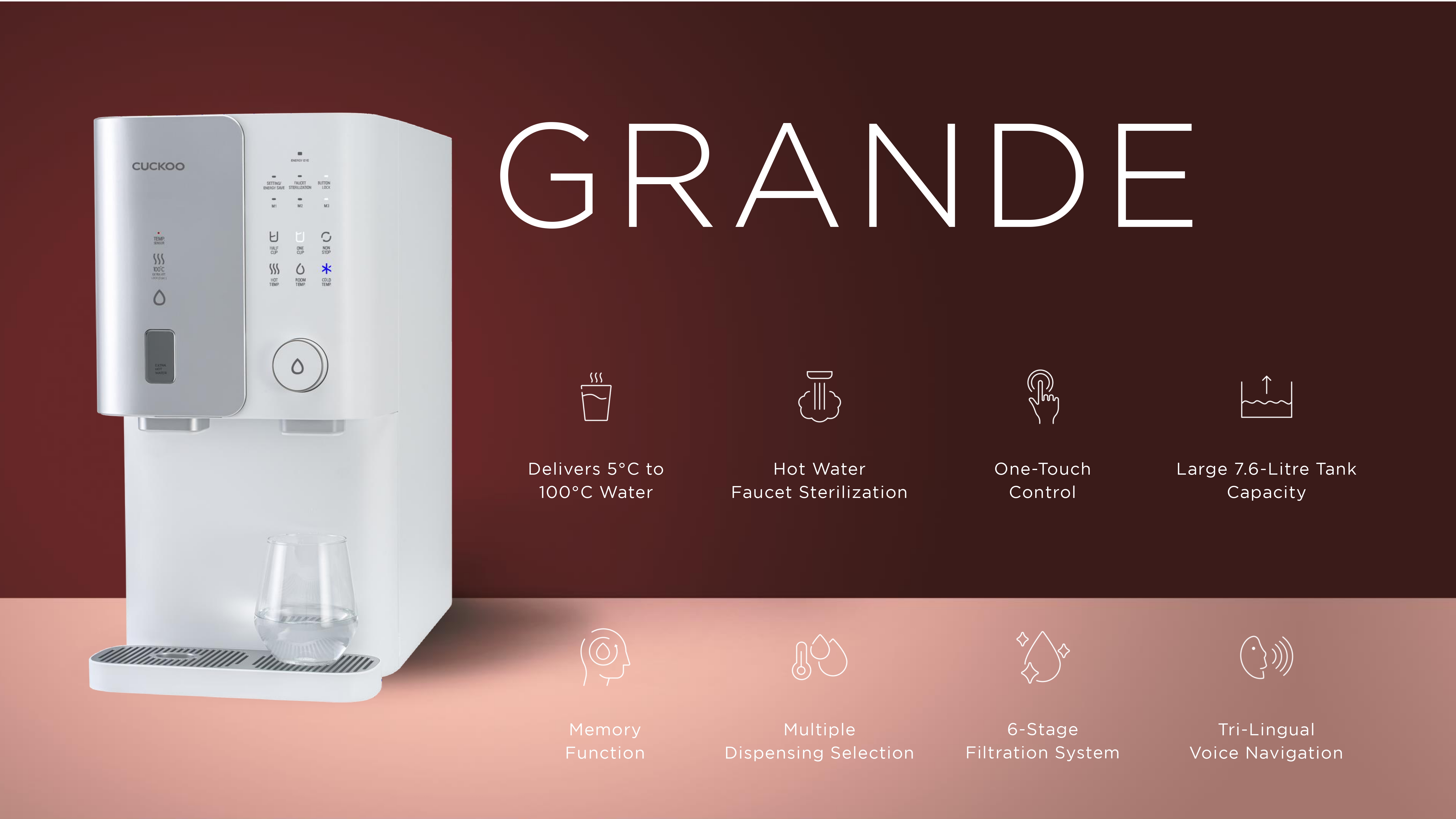 But the innovation doesn't stop there. The CUCKOO GRANDE goes above and beyond by ensuring not only convenience but also hygiene. Its sterilization feature utilizes water at 100°C to cleanse the faucet, effectively removing 99.9% of bacteria*, providing you and your loved ones with peace of mind with every dispense. Embrace the future of water dispensing with the CUCKOO GRANDE – where functionality, style, and hygiene converge to elevate your daily routine to new heights.