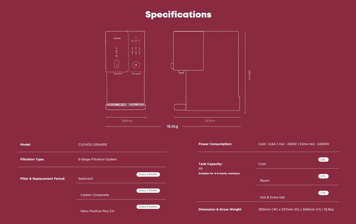 Introducing the CUCKOO GRANDE, the epitome of innovation and convenience in water dispensing technology. Designed with a capacity-packed and feature-loaded structure, it caters to the diverse needs of every household while exuding an elegantly minimalistic charm that effortlessly complements any space. With just a single touch, experience the seamless transition from a refreshing 5°C to a piping hot 100°C, offering a range of temperatures including cold, room, warm, hot, and extra hot water at your fingertips in mere seconds.